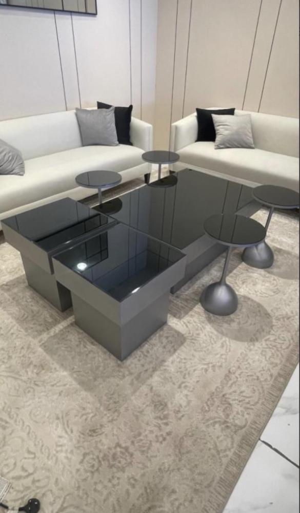 طقم طاولات فاخر مكون من 7 قطع بتصميم هندسي معاصر، يتميز باللون الأسود الأنيق والرمادي وسطح زجاجي عاكس يضفي لمسة من الفخامة والحداثة.